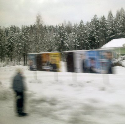KUVALA.fi - 2012/01/15 - Ilta-Sanomien presidenttigallup on täyttä humpuukia. Kaikki tulokset on esitelty röyhkeästi väärin. Virhemarginaalit on unohdettu. 14.01.2012. -24 kuvaa. Lunta, taidetta, rompetta, vaaleja ja koirantossut. Kuvia lauantaina 2012-01-14 klo 11-15. Keski-Suomi. Jyväskylä. Tourujoki - Rajakatu - Harjukatu - Paviljonki - Irish Bar - Aalto-sali - Våinönkatu. 1. Tourujoki on jäätynyt. 2. "Liskopatsas", Kari Alonen, ammattikorkeakoulun jaAlvar Aallon suunnitteleman ensimmäisen (?) asuinkerrostalon kupeessa. 3. Kauppamiesten näköispatsas. 4. Harjun kioski on muuttunut kioski "55":ksi koulukompleksin vierellä. 5. Jyväskylän Paviljonki ja korkeutensa saavuttanut Sokos-hotelli. 6. Sisään.7. Teuvo Hakkarainen hymyilee aulassa keskustelun välistä, pyynnöstä. 8. Rompepäivät vetävät väkeä niin, että on erehtyä sinne. 9. Toimi Kankaanniemikin on saapunut Timo Soinin puhetilaisuuteen. 10. Yleisön joukossa on julkinen Pekka Haaviston, "kakkosen", kannattaja. 11. Pieni kuulija ei innostu Soinin puheesta, jossa tämä mm. kertoo menettäneensä ulkoministerin tai valtiovarainministerin paikan pitäessään kiinni periaatteistaan. 12. Pentti Varkila soittaa huuliharpullaan "Finlandian" tilaisuuden alussa. Soini istuu ja Anitta Kangas seisoo. Paikalla on varmaankin parisataa kuulijaa, kun nonstop-kävijätkin lasketaan mukaan. 13. Paviljongin yläaulassa kahvittelusta tullessa törmää Jaakko Valon vuonna 2006 valmistuneeseen "Kulta-aikaan", vaneri, akryyliväri ja lyöntikulta.14. Rompetorilta Isä on löytänyt kaipaamansa pakoputken. 15. Irish Barin lämpöisessä tunnelmasssa voi vain muistella, kuinka lämmintä ulkoterassillakin kerran kesällä oli kun siellä nyt talven viima puhaltelee. 16. OHOH- ILTASANOMAT repäisee ainakin kunnon otsikot, kun se taas kiihdyksissään unohtaa "tutkimuksen" virhemarginaalit! 17. Paavo Lipposen vaalimainokset lumessa Aalto-saliin houkuttelemassa. 18. "On the Sunny Side of the Street" vain soluu taitureiden esittämänä, pianisti Marian Petrescu ja basisti Mihai Petrescu. Sali on täynnä, ylhäällä parvella on kyllä hyvin tilaa myöhästyneellekin. 19. Puolueen puheenjohtaja, valtiovarainministeri Jutta Urpilainen kehuu Paavo Lipposta ja muistuttaa kuinka gallupit nujerrettiin viime eduskuntavaaleissa. "Tasavallan presidentin virka ei ole mikään ulkosuhteiden harjoittelupaikka". 20. Kahvia tarjoilemassa ihan samannäköinen nuori nainen, joka Asunnottomien yön iltatunneilla tarjoili hernekeittoa ulkona Kompassin nurkilla viime syksynä. 21. Kahvijonot. 22. Rompetorilta tai sitten muualta tullut sivuvaunuilija pyörähtää Väinönkadulla. 23. Pieni koira näkee toisen pienen koiran kadun aurinkoisella puolella. 24. Söpöliinille on laitettu töppöset jalkaan tässä kahdeksan asteen pakkasessa, joka tuntuu kovin kylmältä viimaisina hetkinä. - Mobikuvat: Pertti Manninen. - TOP 20 Joulukuu 2011  - Ylen mahdoton tulos. Gallup julkaistaan ikäänkuin ehdokkat eivät saisi 100 prosenttia hyväksytyistä äänistä! TÄNÄÄN ENNAKKOÄÄNESTYKSEN ALKAESSA YLEN RADION VAALIASIANTUNTIJA SAMI BORG KERTOO ... - KAUPPALEHDEN PARETSKOIN KOLUMNI.  - Sauli Niinistö, Paavo Lipponen, Paavo Arhinmäki. - Kuva.  Vaikea valinta. - 2012 Presidentínvaalit Ennustukset: Pressa 2012 ennustus lokakuun alussa. Pressa 2012 ennustus joulukuun alussa. - Kunnianloukkaussyyte käsitellään keskiviikkona 18.1.2012 klo 10.30 - Pertti Manninen, xxxxx xxxxxxx, xxxxx xxxa, Keski-Suomen käräjäoikeus - Presidentinvaalit 2012 - Julisteet tänään katukuvassa. Kuva: " 2, 3, 4, 5, 6, 7 tai joku muu". -  Kuvat. "01.01.2012". -  "The Jazzman" Kuva. - "Kiven hehku". Kari Alonen 2010. -- Lukijan kuva: "Katso tuolla on Hakkarainen!" - Kuva. Käden ojennus. Karuselli. - lsunnuntai 15.01.2012 - etusivu - Nettisanomat - Sanomanetti - Blogi: Viikkosanomat.fi - Kuvasanomat - Sanomatori  - Viikkosanomat - Härkää sarvista  Kari Allonen, Alvar Aalto, Jaakko Valo, Pentti Varkila, Anitta Kangas, Timo Soini, Pekka Haavisto, Paavo Lipponen, Jutta Urpilainen, Ilta-Sanomat, gallup,  Sami Borg, Paretskoi, Kauppalehti, Yle, Gallup, Presidenttiehdokkaat, julisteet,  katu. Uusi vuosi - saalis - siivet - Nilakka - hämärtyvä ilta. Kunnianloukkaus, Nettisanomat, päätoimittaja, xxxxx xxxxxxx, asianajaja, xxxxx xxxa, Nordea Pankki, myyntipäällikkö.